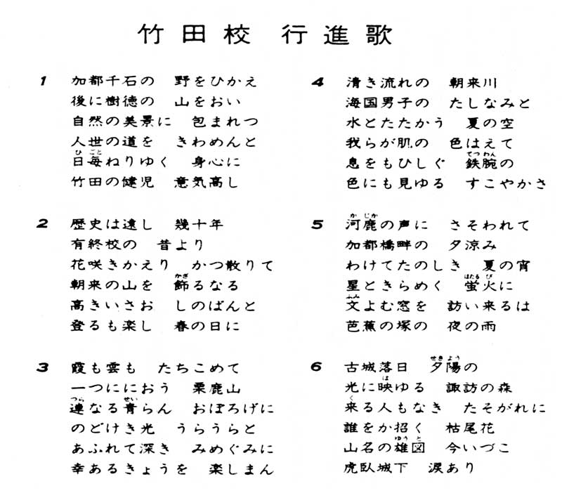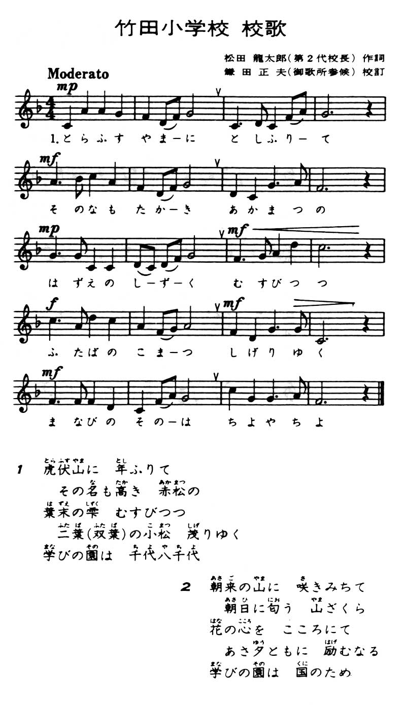 竹田小学校校歌の一番には「虎臥山に年ふりて、その名も高き赤松の」とあり、戦前の卒業生には一入なつかしい竹田校行進歌の六番に「古城落日夕陽の--山名の雄図今いづこ、虎臥城下涙あり」と歌われつづけている。