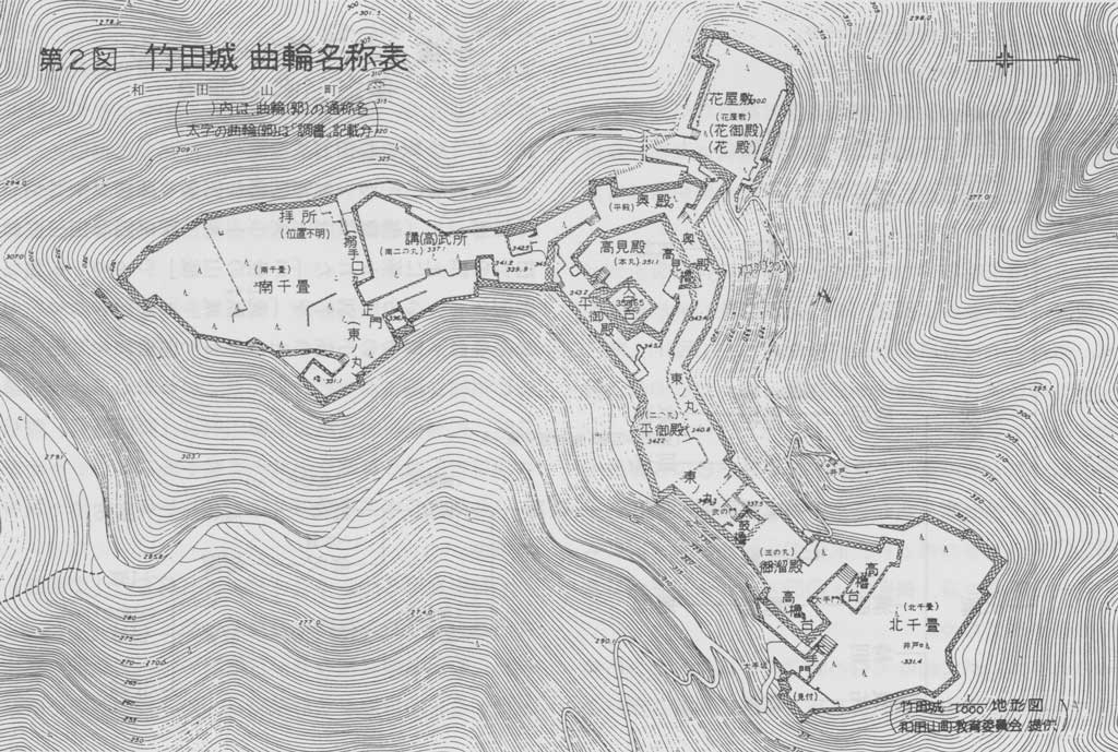 頂上の縄張りは、東西約一○○メートル、南北は約四〇〇メートルもあって、天守台・天主曲輪(くるわ)・二の丸,三の丸・北千畳・見付櫓・平殿・花屋敷・東の丸・南千畳と堂々たる構えが現存し、かっての日の偉容をもの語っている。