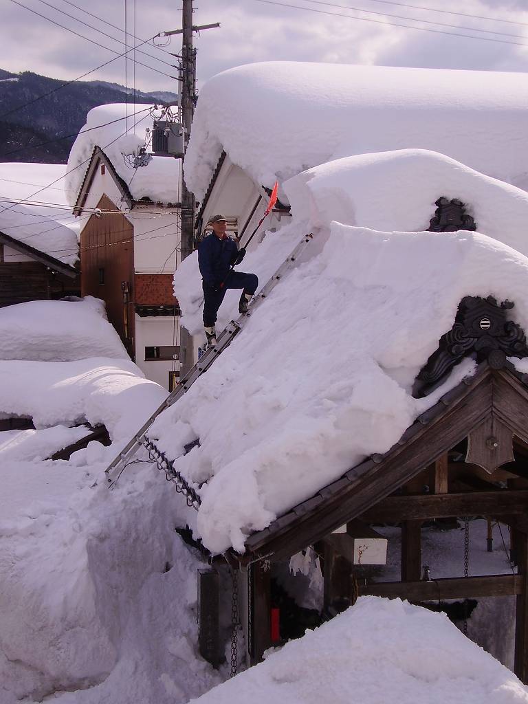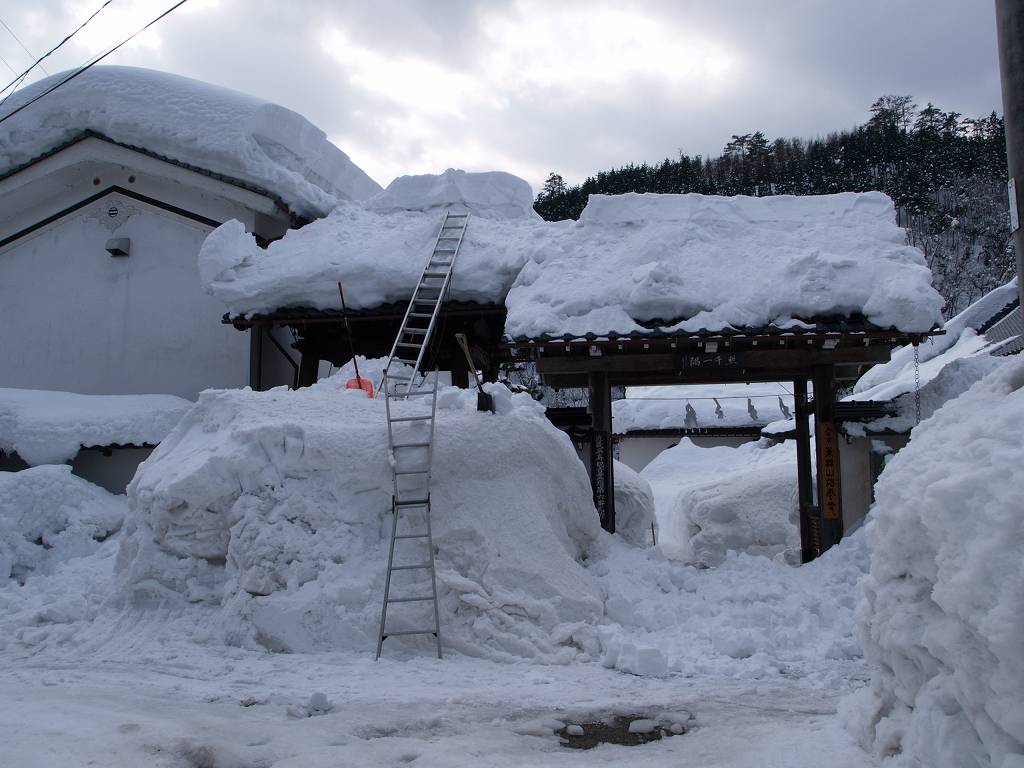 正月明からダラダラと降っていた雪は5日間程度続き、積雪量は既に2メートルを越え、「一刻も早く屋根下ろしをしなけれ・・・」と限界に近いところまで到達していました。もちろん雪が降っている最中でも出来るところから上っておろしていたのですが、お寺ですからやるべき所は幾らでも待っている。